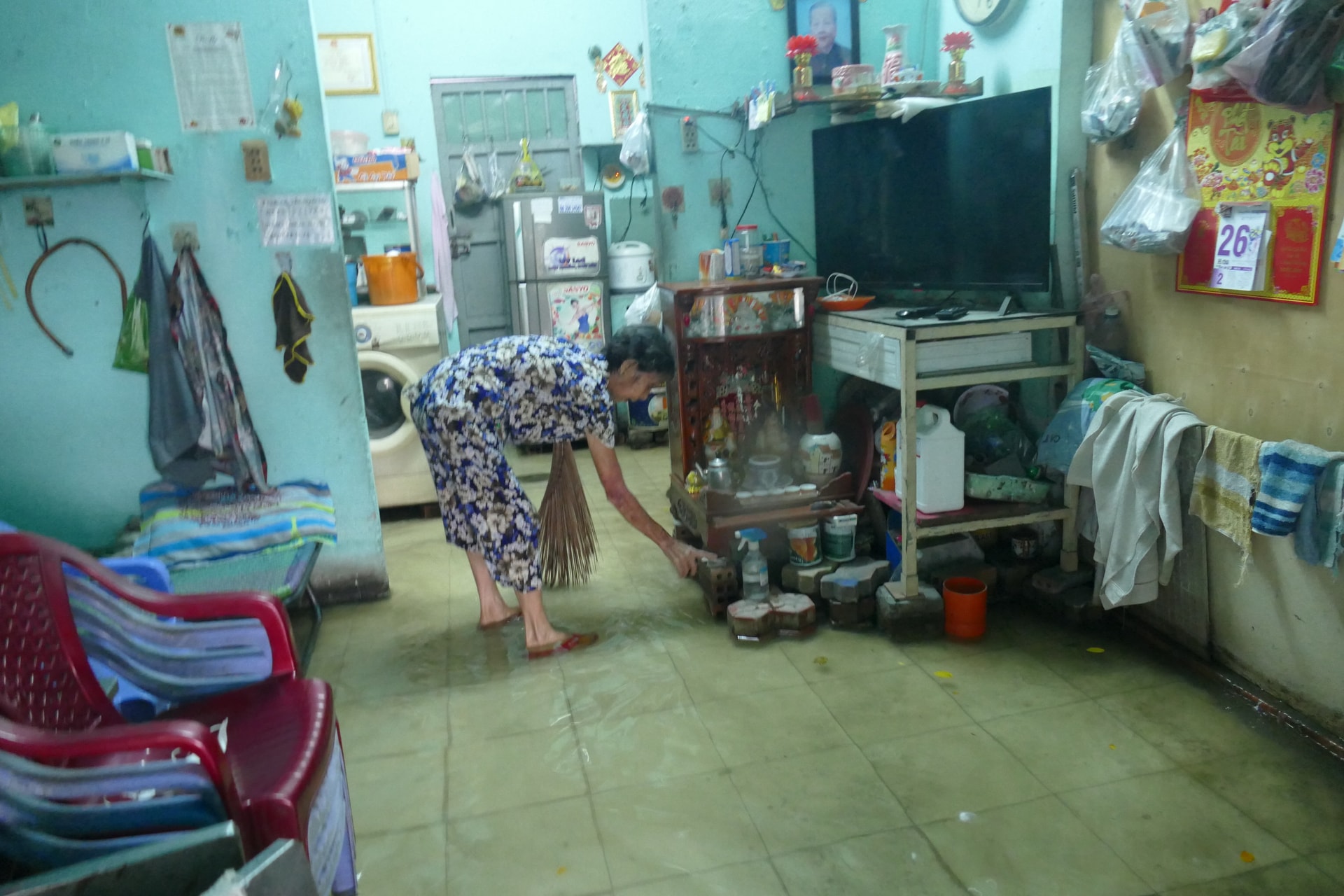 Những ngày này, cô Mười (ngụ Quận 7) phải dùng gạch kê các đồ dùng lên cao để tránh hư hỏng. "Ngập lắm, nhiều đêm nó dâng cao ướt hết đồ, cứ đến ngày nó lên là khổ", cô Mười than vãn